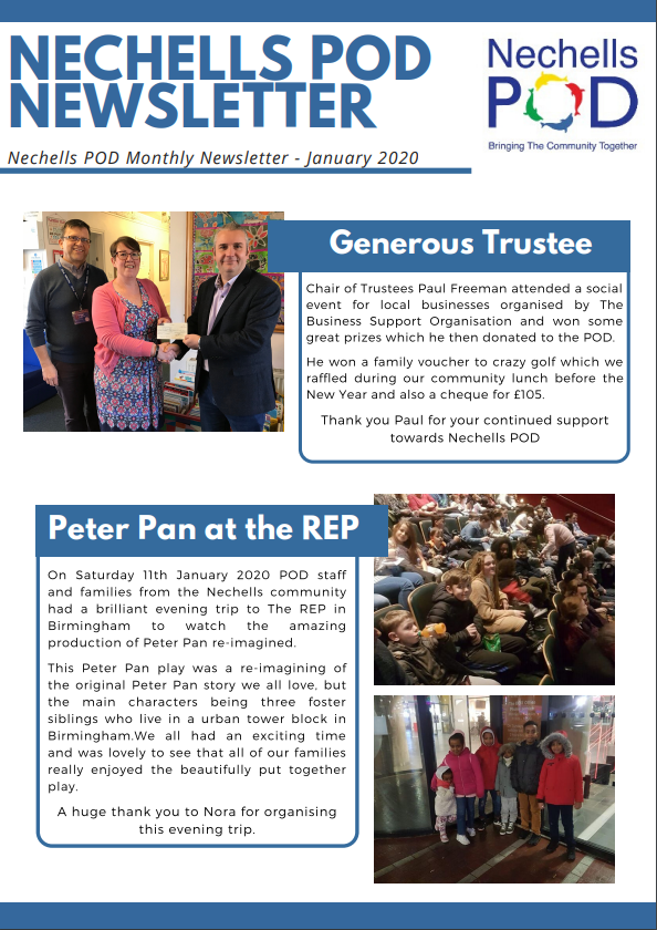 Find below the newest edition of the Nechells POD monthly newsletter. Category: 2020By NechellsPODFebruary 6, 2020 Author: NechellsPOD Post navigationPreviousPrevious post:Peter Pan at The REPNextNext post:Noran’s Retirement PartyRelated postsA Festive Season full of KindnessDecember 18, 2020Nechells POD Covid-19 UpdateSeptember 15, 2020Bloomsbury Library at the PODSeptember 4, 2020Emergency Food availability in LadywoodAugust 13, 2020‘Party at the POD’ Week 1August 4, 2020Nechells POD ClosureMarch 19, 2020